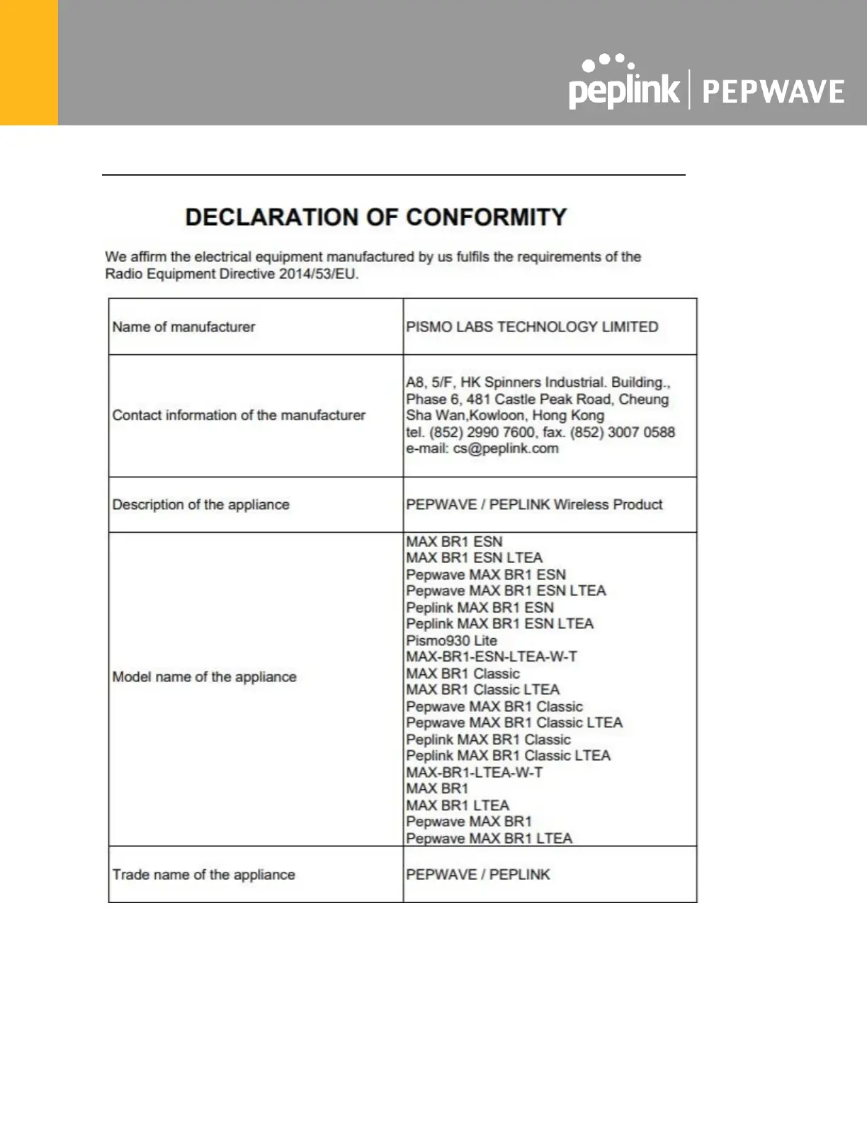 CE Statement for Pepwave Routers ( MAX BR1 Classic for MC7455)
