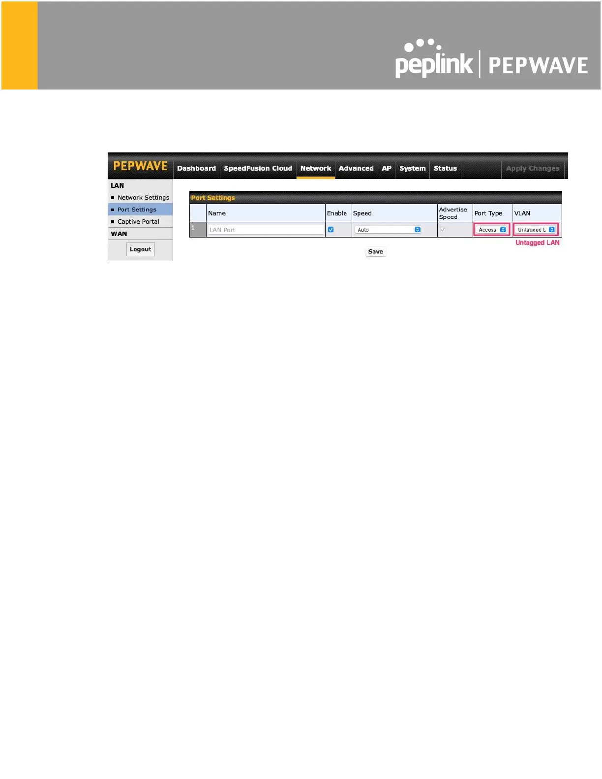 5. Set the Port Type to Access and set VLAN to Untagged LAN (see picture below).