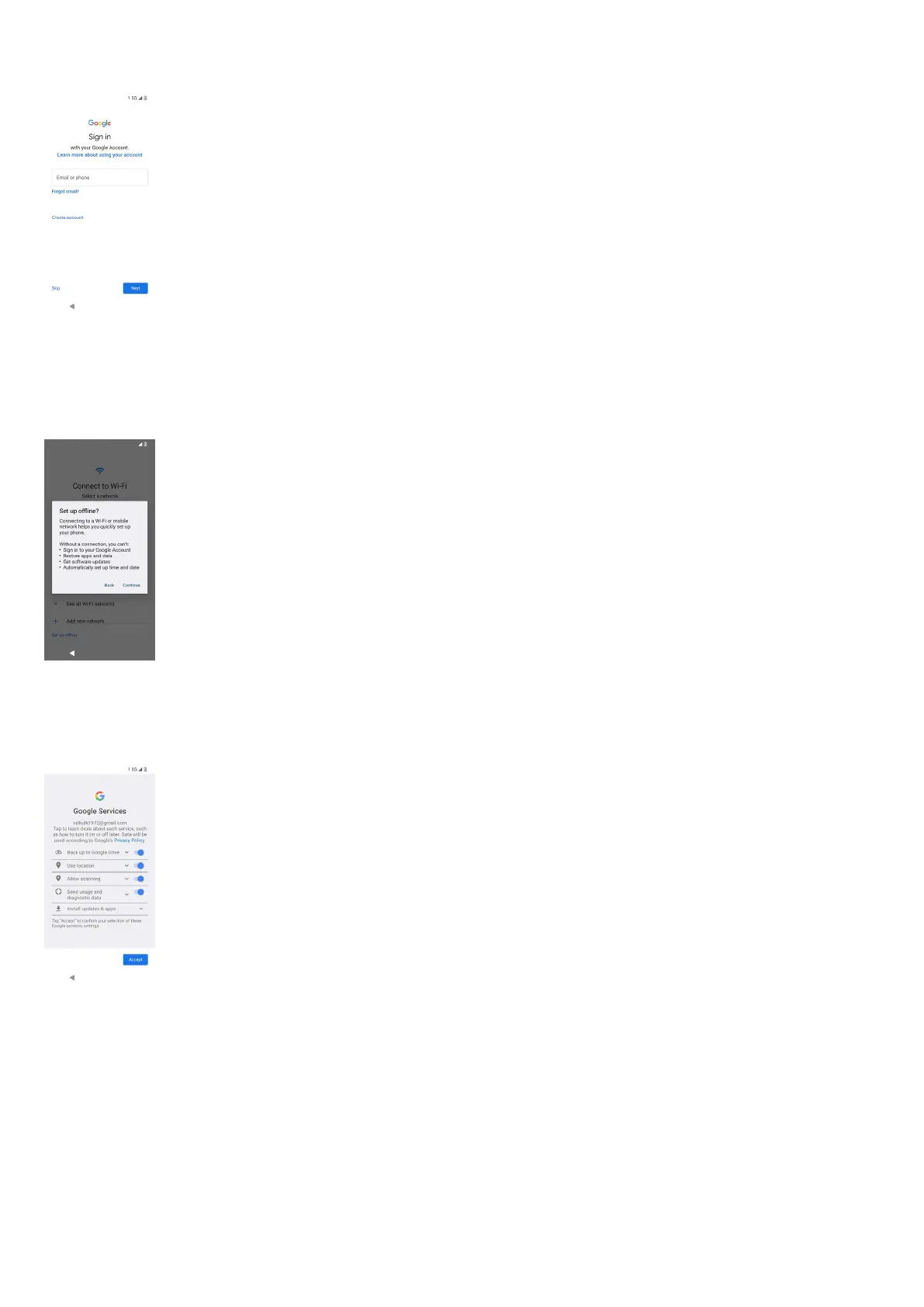 2. If you select the Setup Offline option, the Google Services page is displayed. Accept and follow the wizard steps to set up