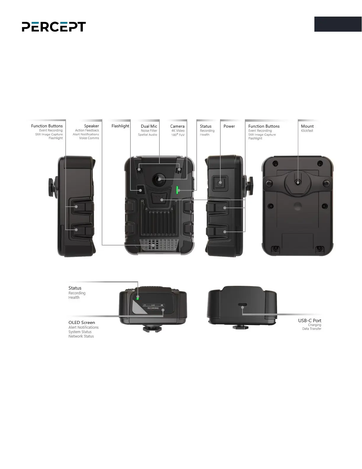 The following images show the different feature elements of the IONODES PERCEPT Body Camera.