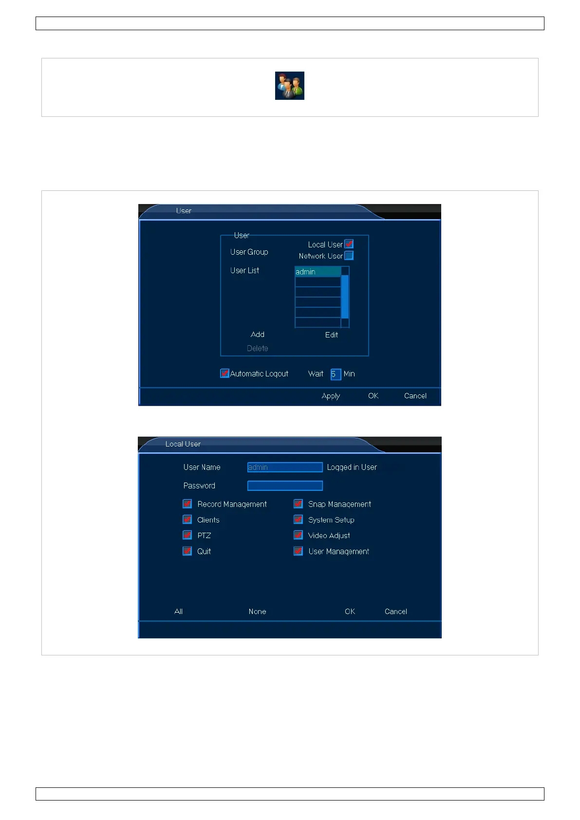 The User menu allows you to adjust all user settings, either a local or network user. Proceed as follows: