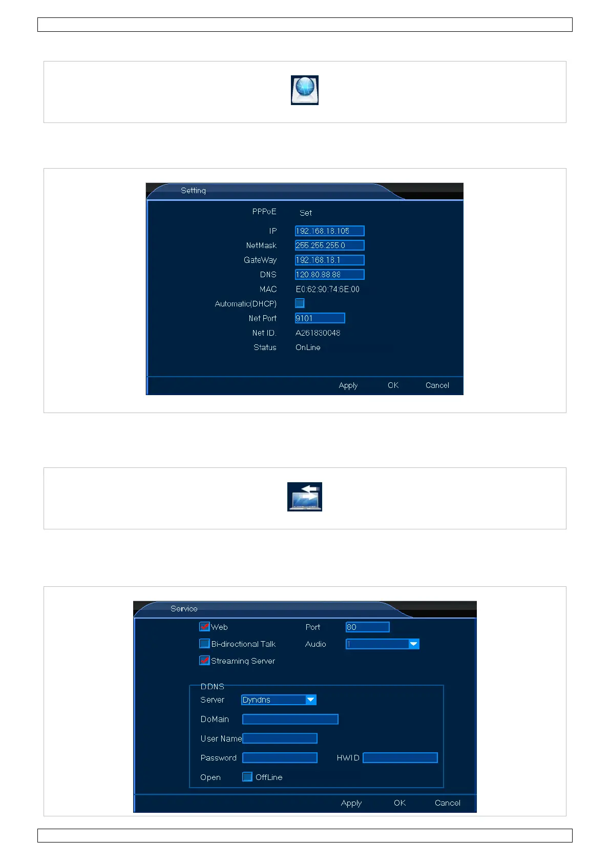 The Service menu allows you to set all network settings. These network settings are important if you wish to
