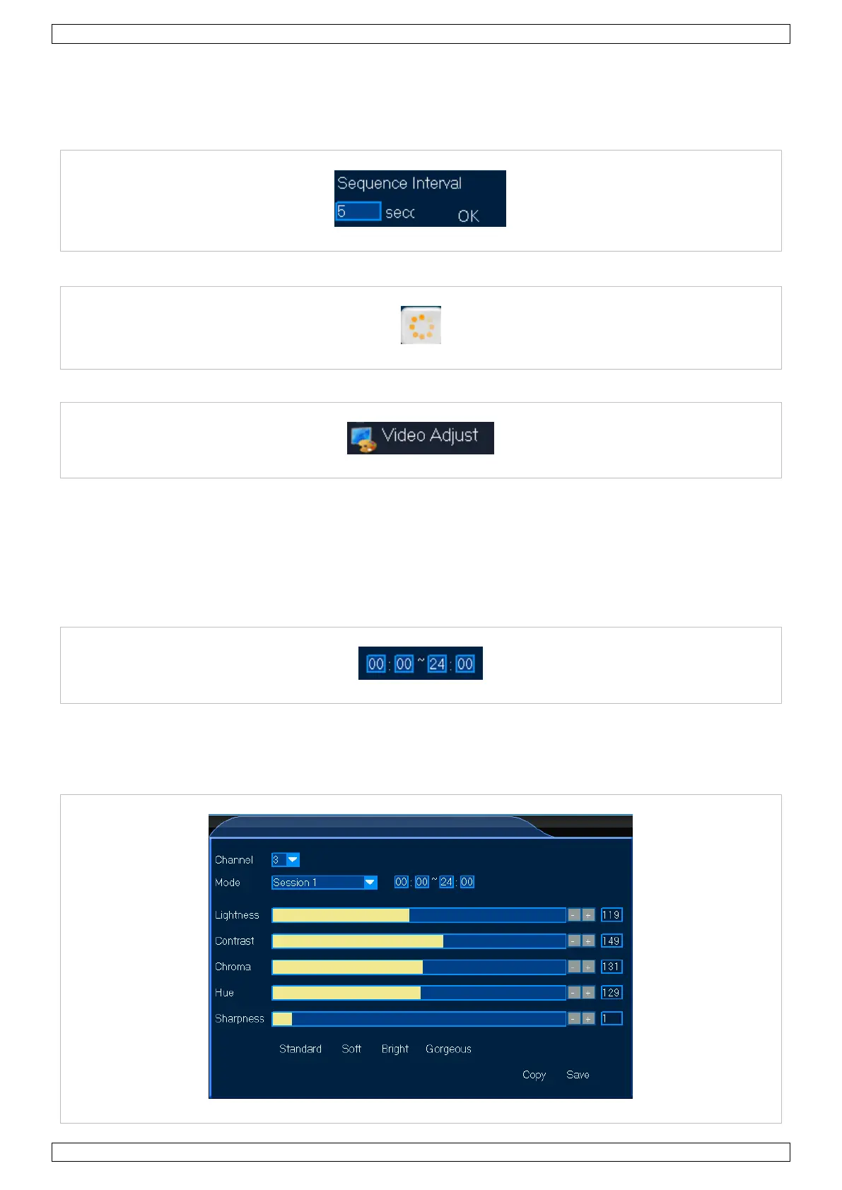 Met het video instelmenu kunt u voor elk kanaal het beeld instellen met aangepaste modi (sessies 1, 2 en 3).