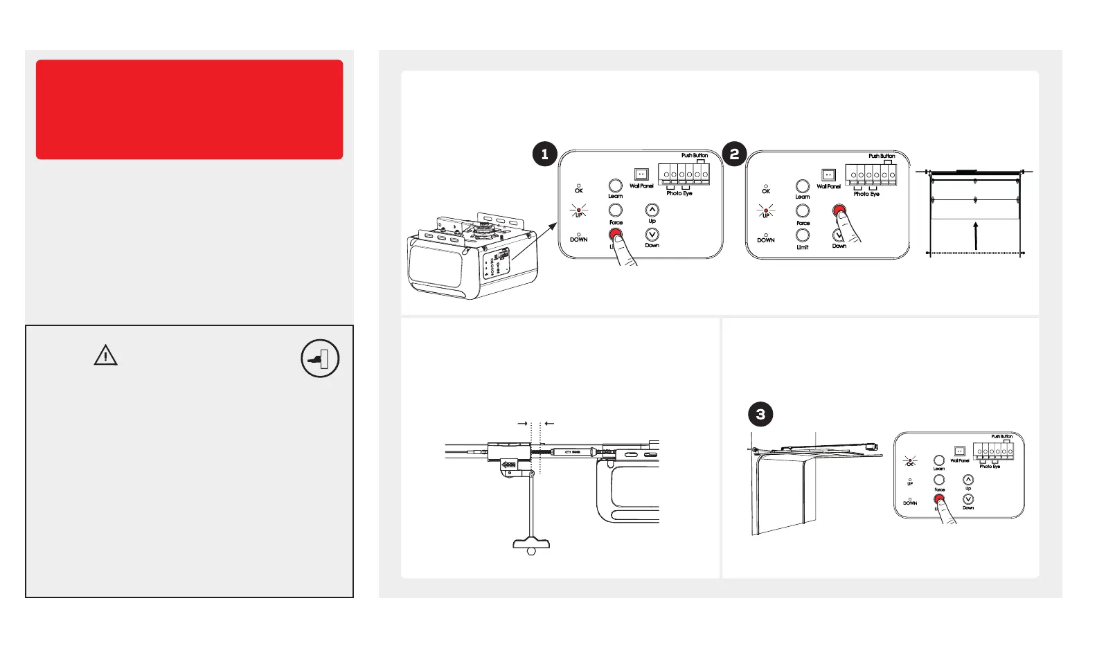 With door in the closed position, press and release “Limit” button, the green (UP) LED will illuminate.