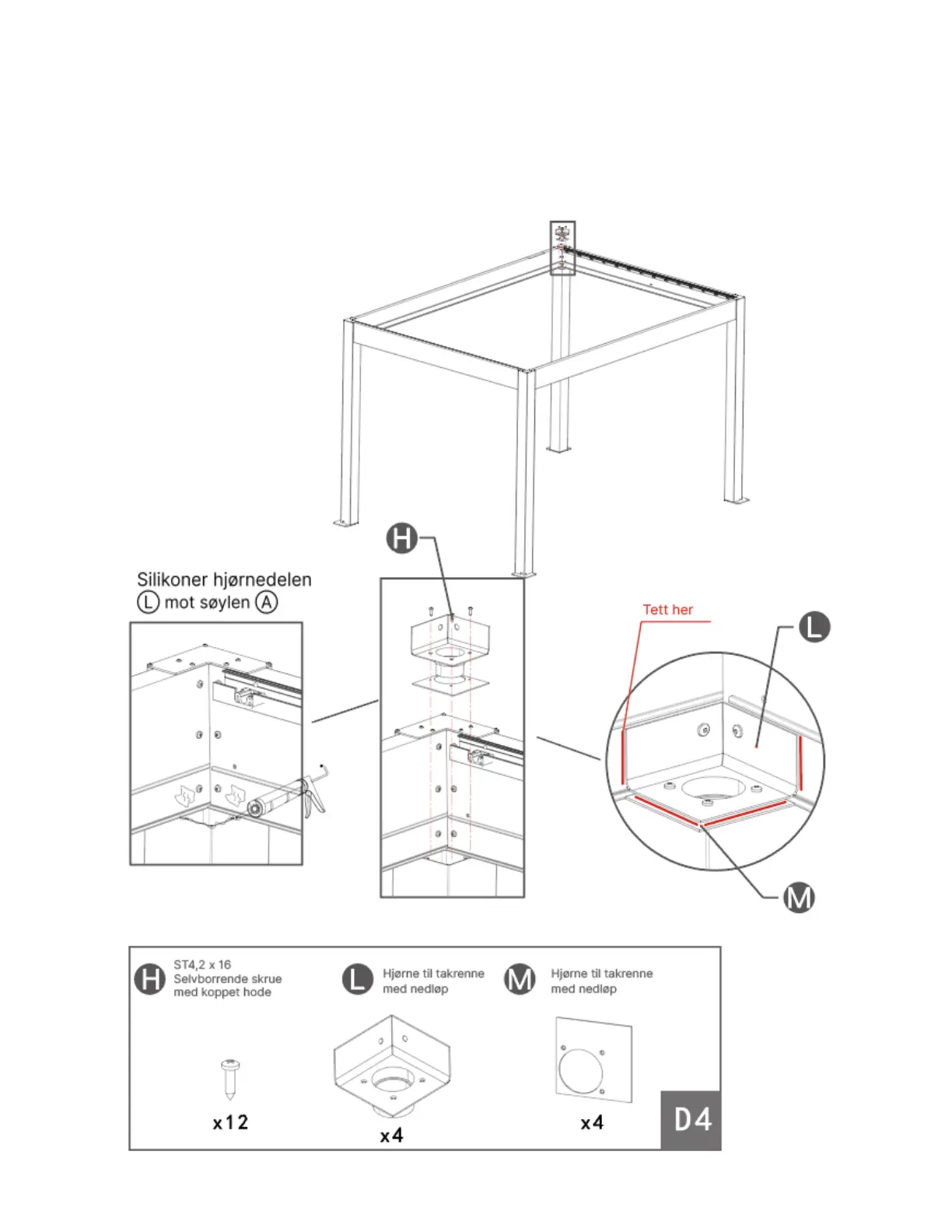 Trinn 6 Monter hjørnedelen Ⓛ med hjørneplatene Ⓜ på alle søylene.