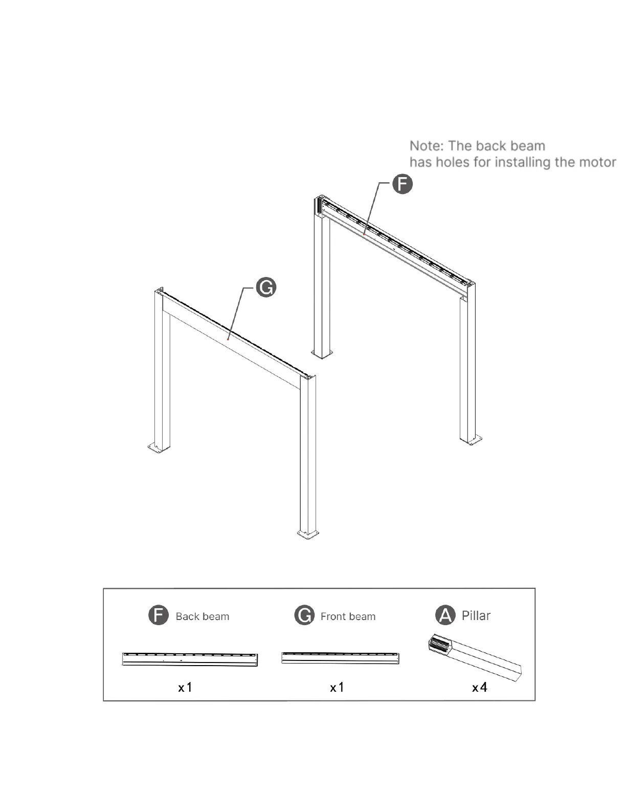 Step 3 Install the beam Ⓖ to the pillars Ⓐ as was done in step 2.
