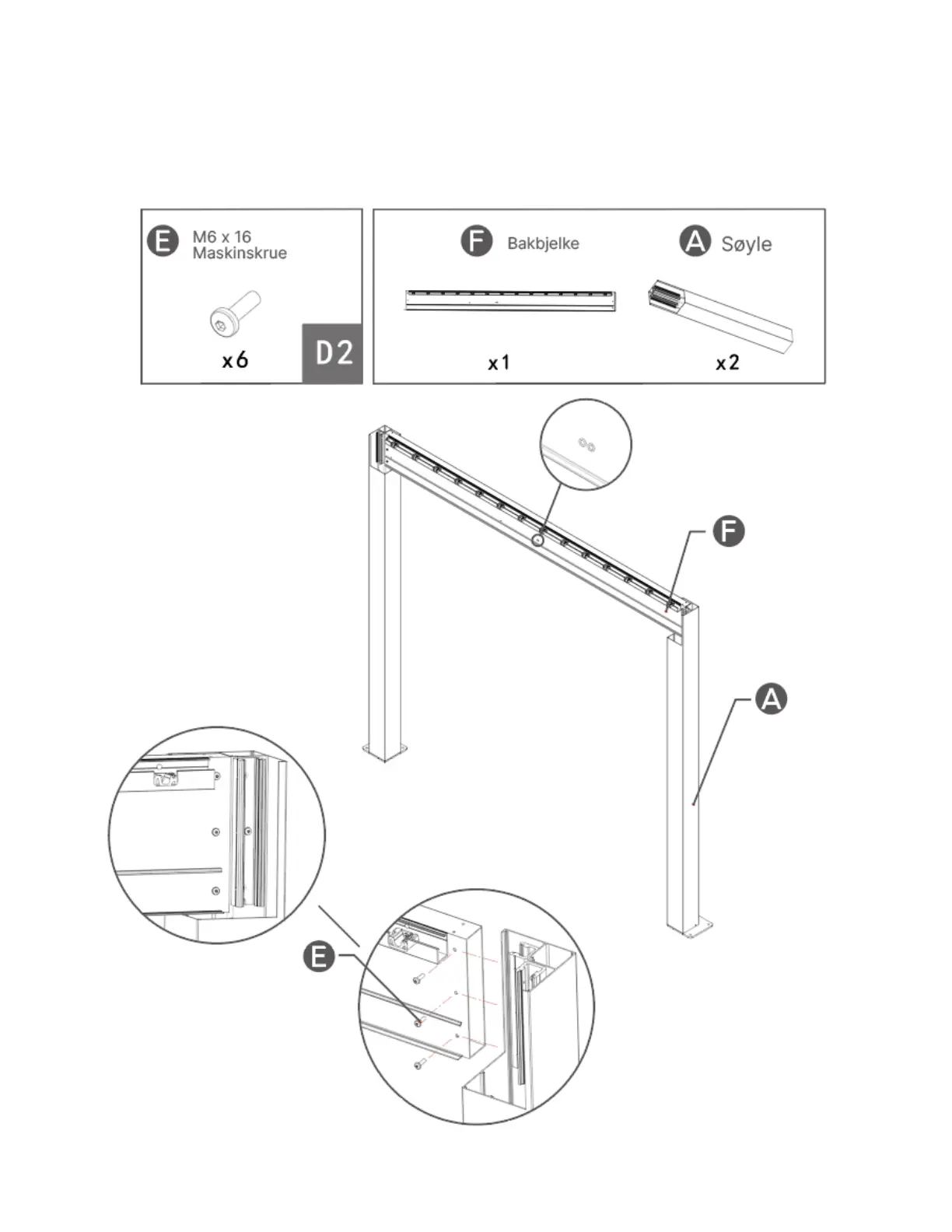 Trinn 2 Fest bjelken Ⓕ til søylene Ⓐ. Stram skruene Ⓔ.