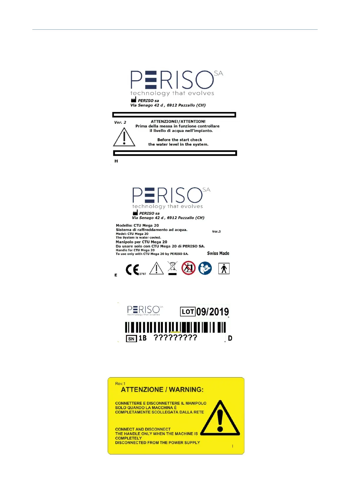 Periso CTU MEGA 20 - Label of the Mobile Arm; Label of the Handpiece; Serial Number Label; Label on the Connector of the Handpiece