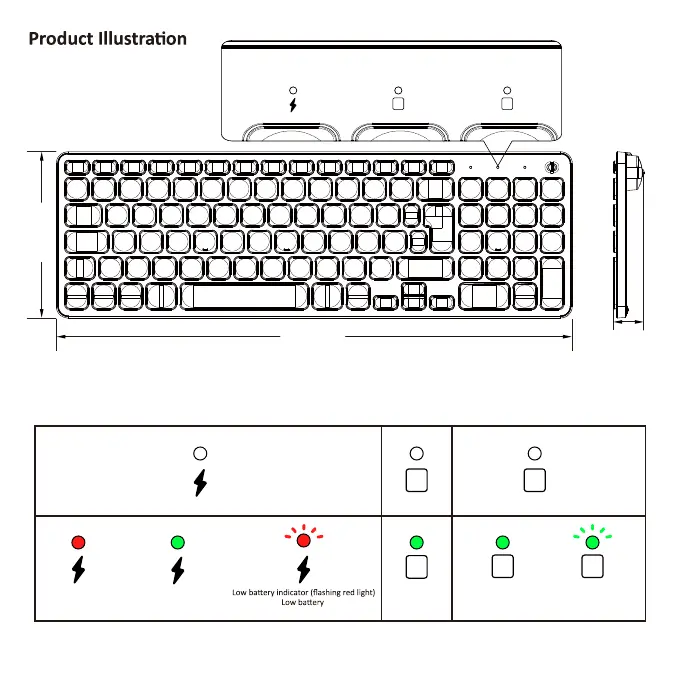 perixx PERIBOARD-733 - Product Illustration and Indicators; Product Dimensions and Layout; Keyboard Status Indicator Lights