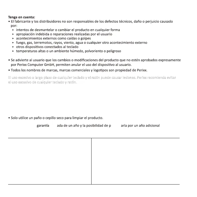 El uso excesivo a largo plazo de cualquier teclado y el ratón puede causar lesiones. Perixx recomienda evitar