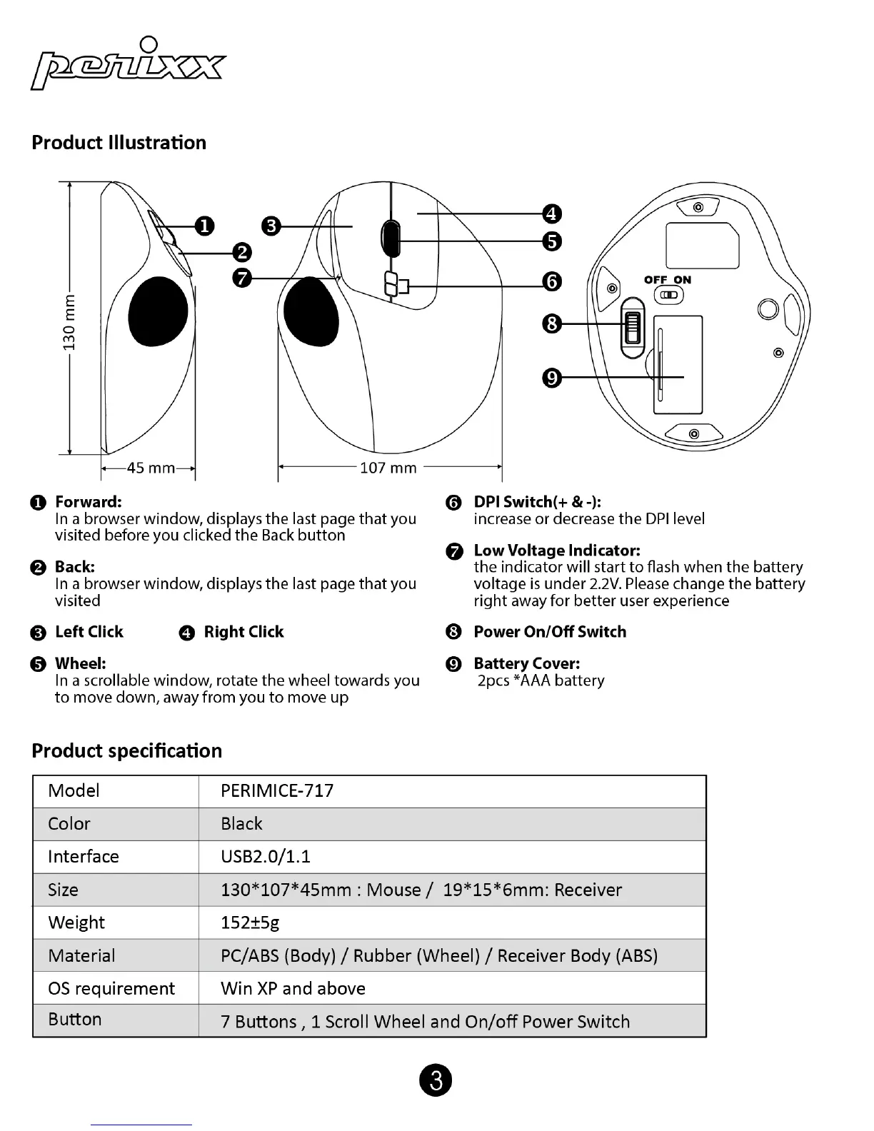 perixx PERIMICE-717 - Product Illustration and Components; Button and Wheel Functions; DPI Switch and Indicators; Power and Battery Access