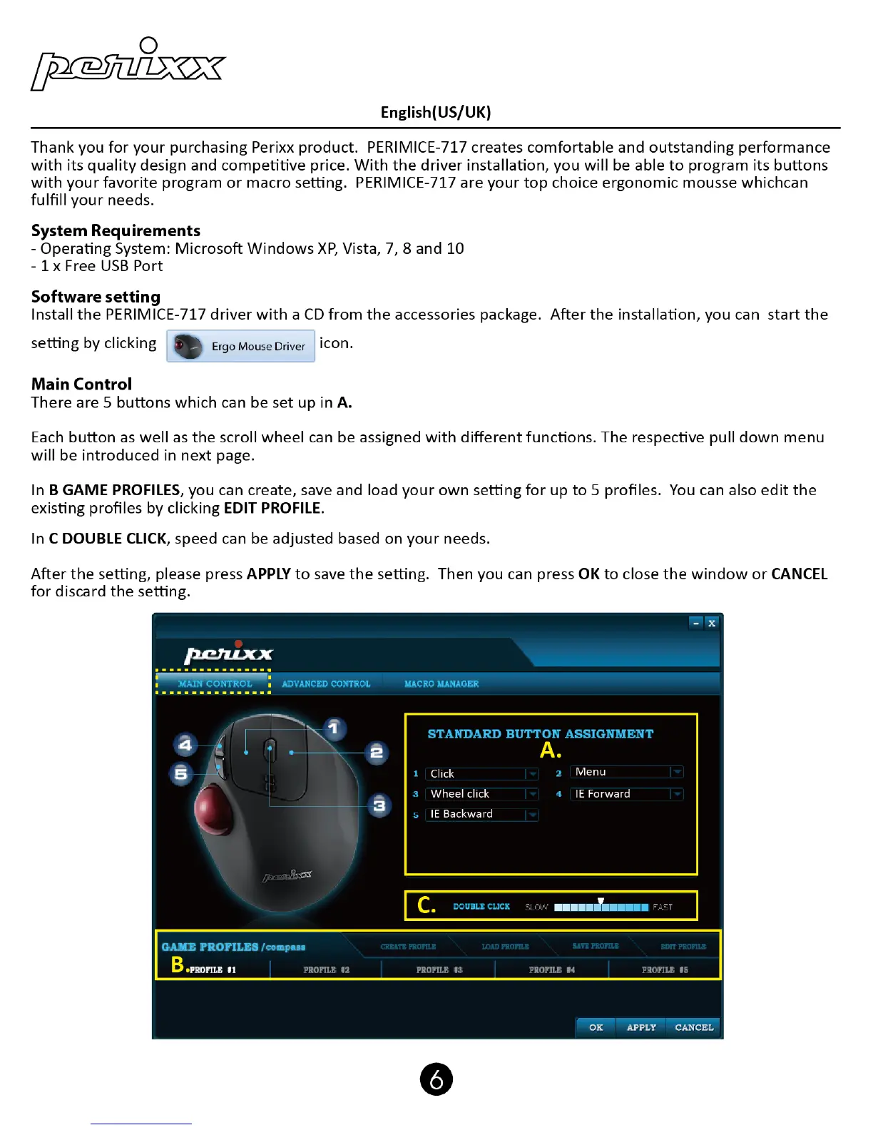 perixx PERIMICE-717 - Main Control Software Interface; Button Assignment Customization; Game Profiles Management; Double Click Speed Adjustment