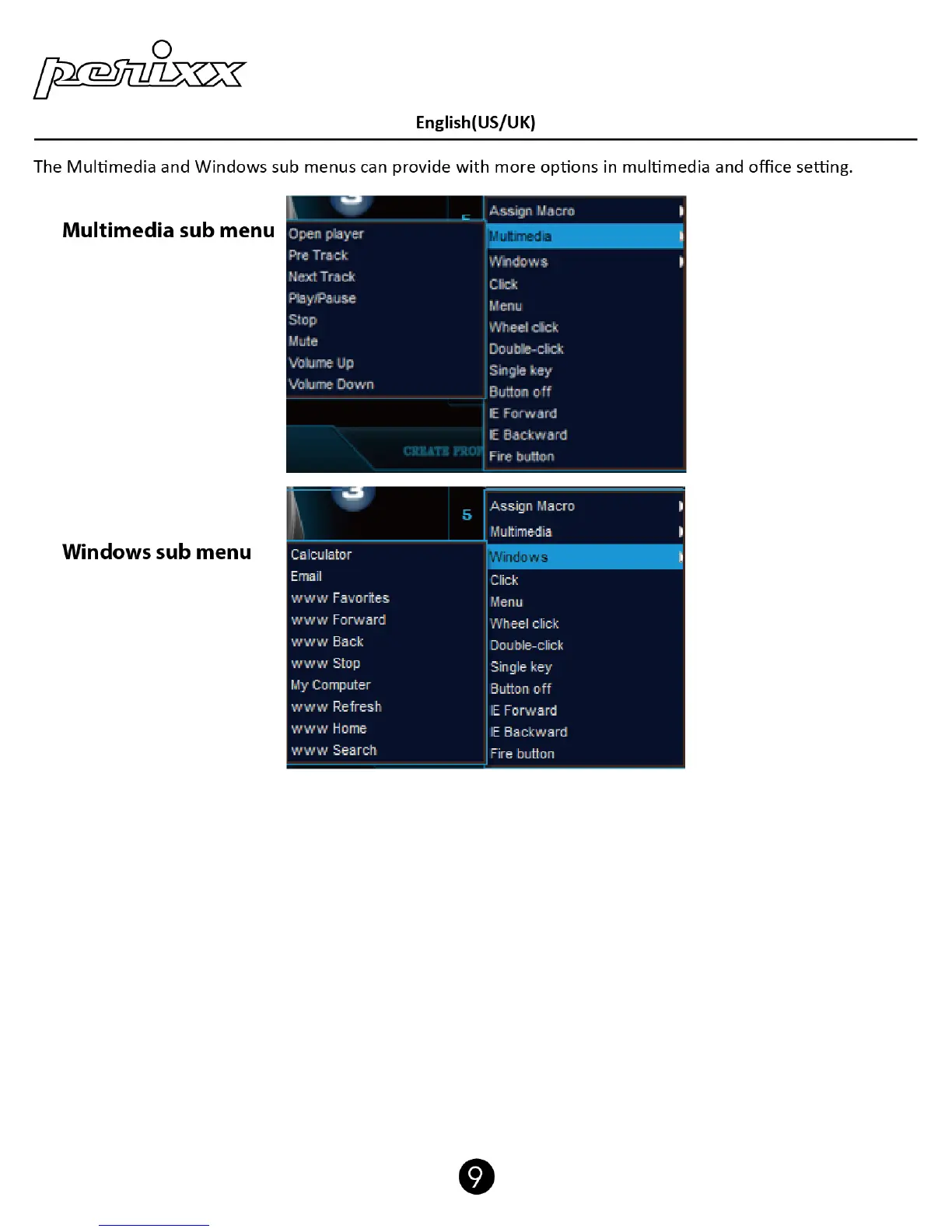 perixx PERIMICE-717 - Function Assignment Menus; Multimedia Function Menu; Windows Function Menu