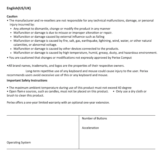 perixx PERIMICE-802 - Safety and Usage Precautions; General Cautions; Important Safety Instructions; Product Specifications