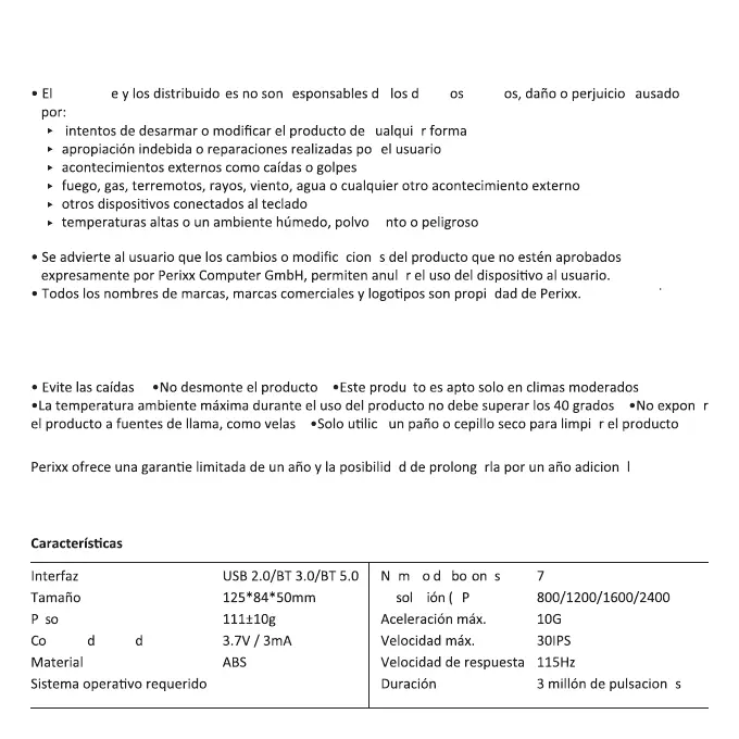 El uso excesivo a largo plazo de cualquier teclado y el ratón puede causar lesiones. Perixx recomienda evitar