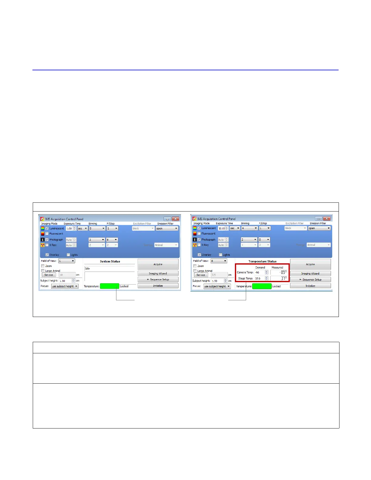 temperatures of the camera and stage.