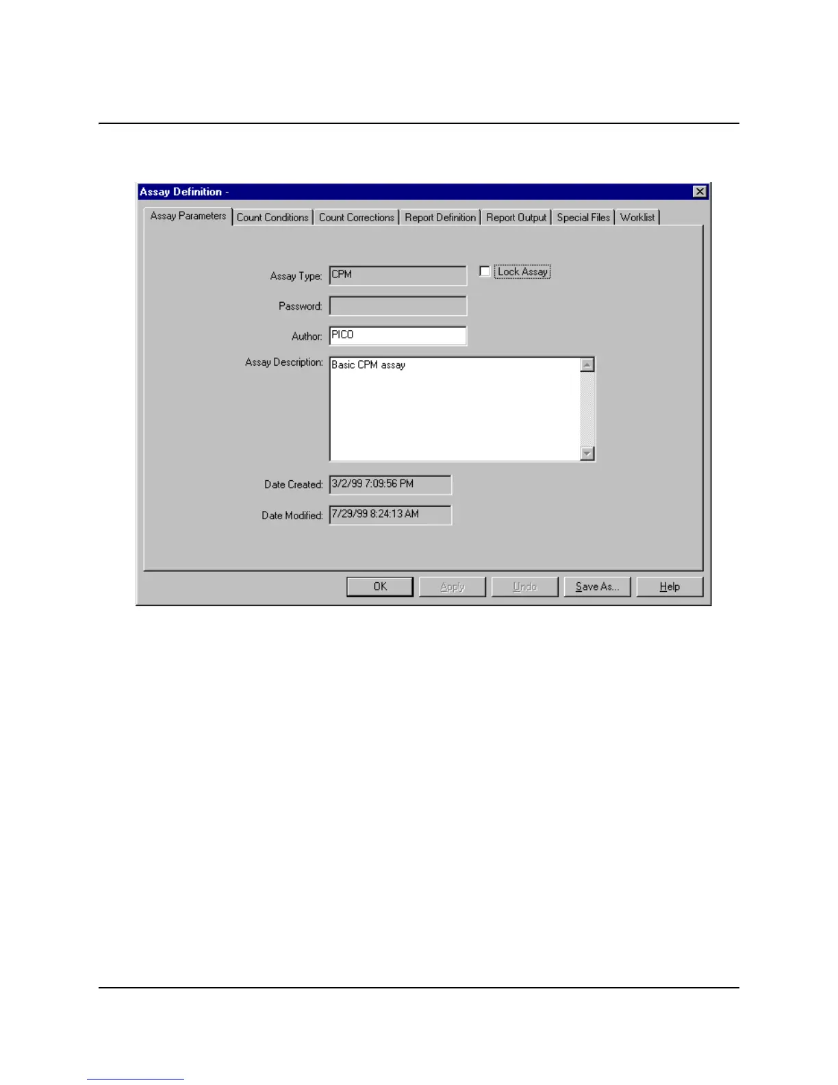 3. In each of the seven tabs of the Assay Definition window, change the assay