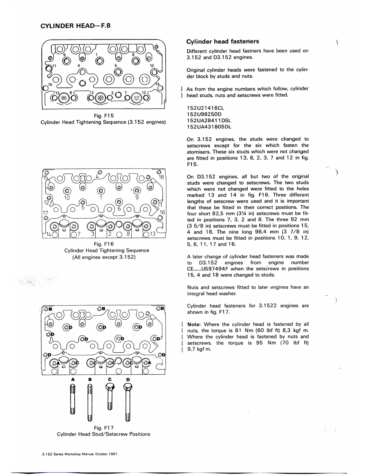 Perkins 3.152 - Cylinder Head Fasteners; Cylinder Head Tightening Sequence; Cylinder Head Stud;Setscrew Positions