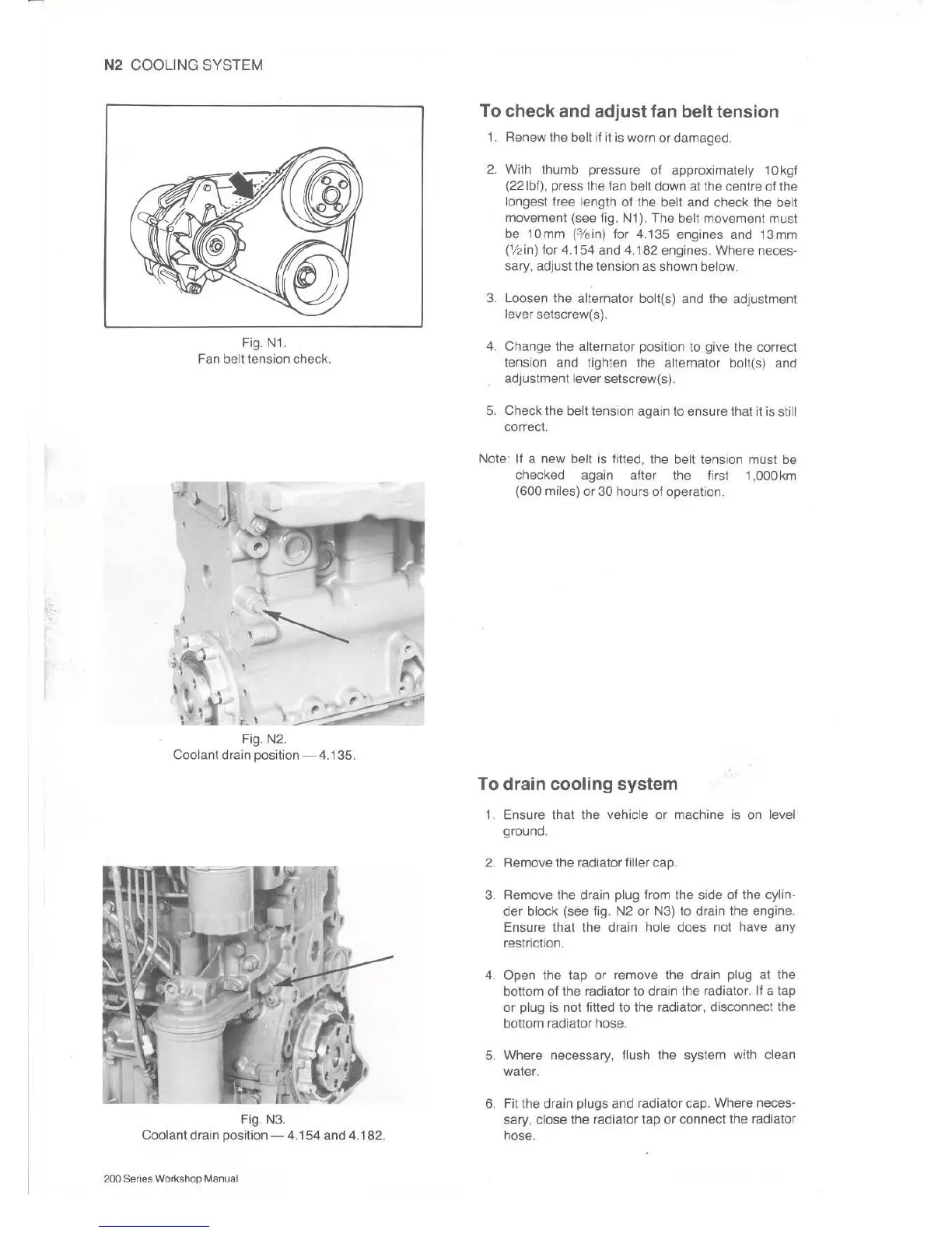 Perkins 4.135 - To Check and Adjust Fan Belt Tension; To Drain Cooling System; Fan Belt Tension Check; Coolant Drain Position - 4.135