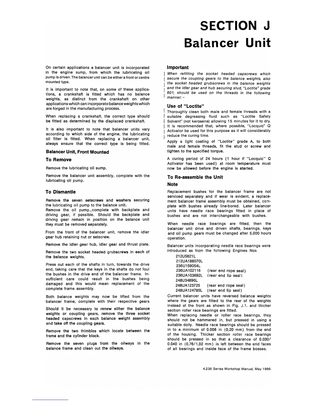Perkins 4.248 - SECTION J Balancer Unit; To Remove Balancer Unit; To Re-assemble the Unit
