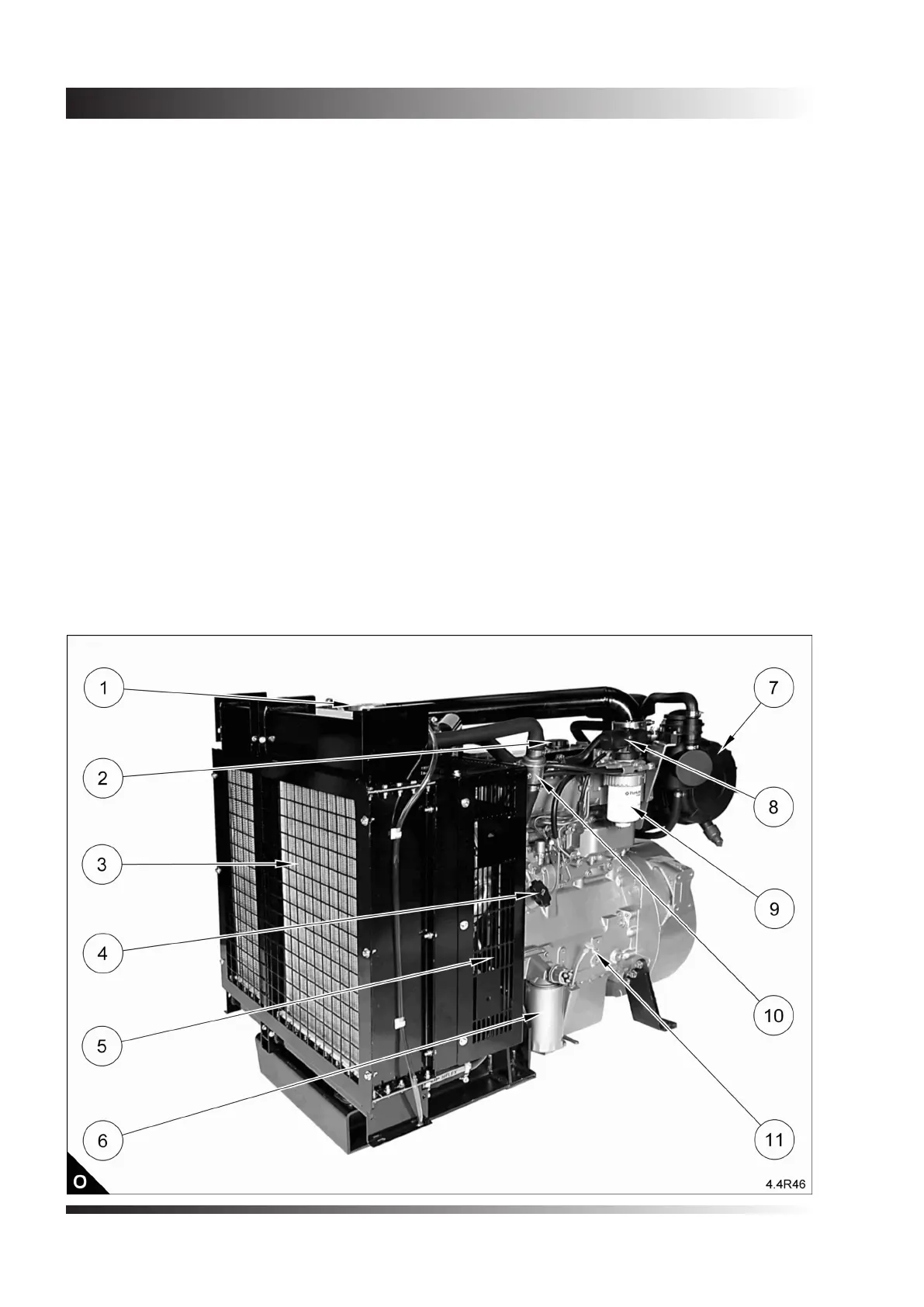 Perkins 415GM - Location of Engine Parts - 4.4 TWGM and 4.4 TW2 GM Radiator; Front and Left Side View (O) of the Engine