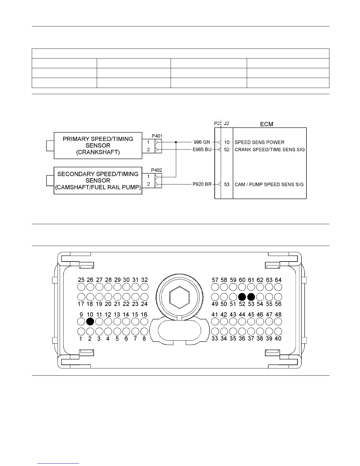 Pin locations on the P2 connector for the speed /timing sensors