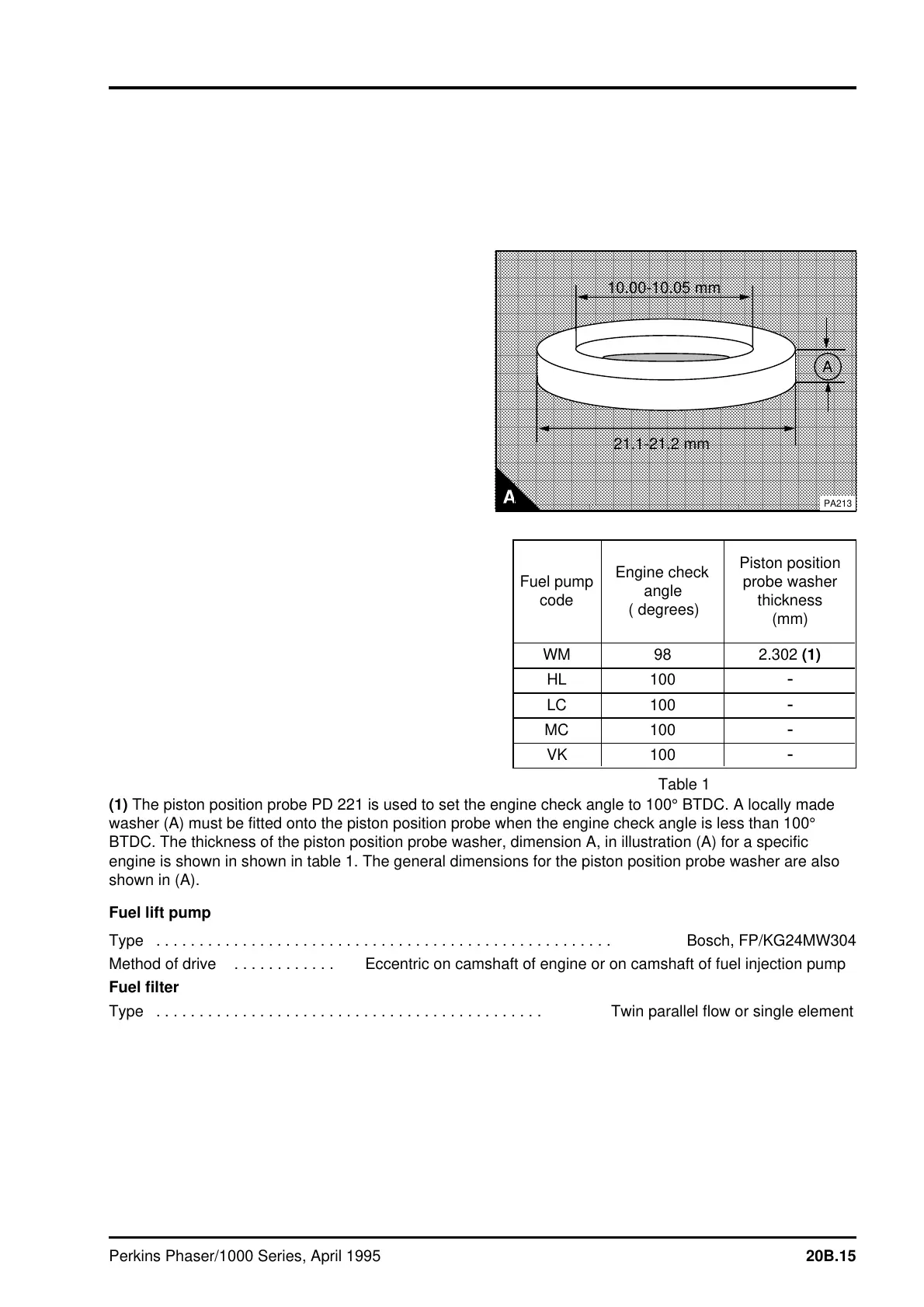 engine is shown in shown in table 1. The general dimensions for the piston position probe washer are also