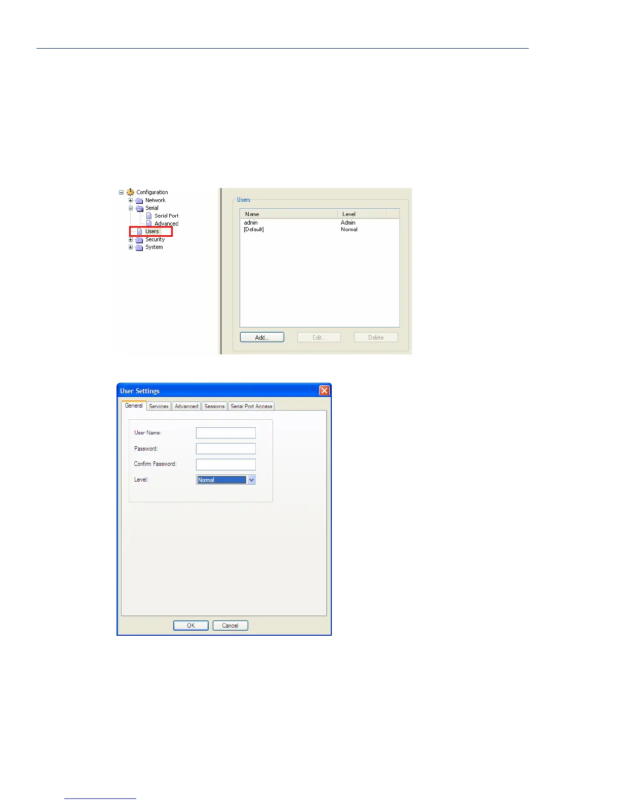 Default user’s parameters are inherited by users accessing a serial port configured for the