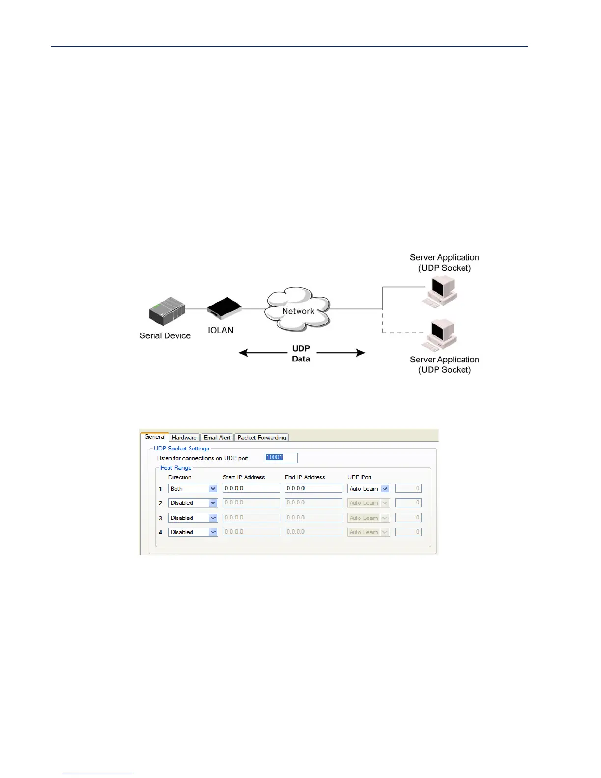 The UDP profile configures a serial port to send or receive data to/from the LAN using the UDP