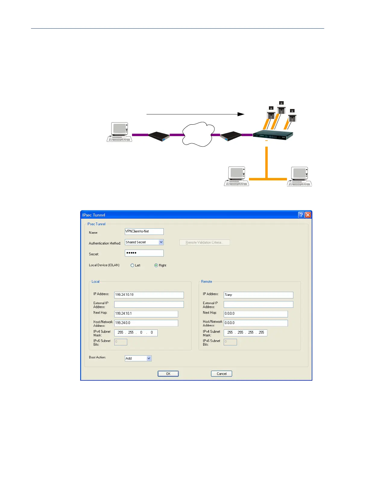 The following example shows how to configure a VPN client-to-network IPsec tunnel. In this