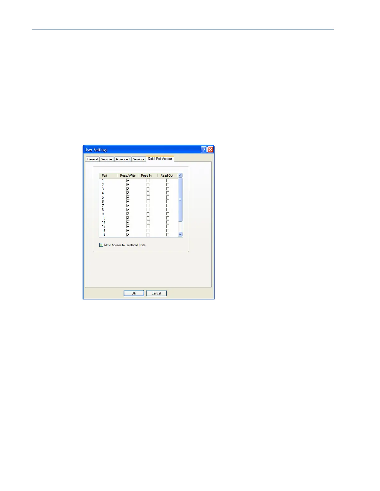 The Serial Port Access tab controls the user’s read/write access on any given IOLAN serial port.