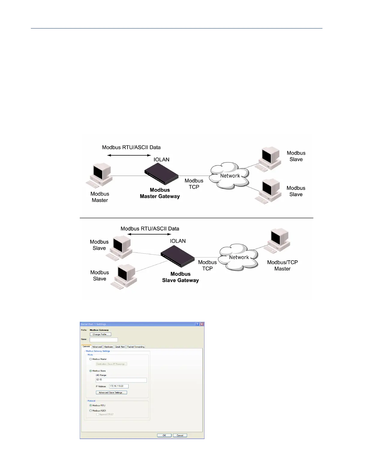 Each serial port can be configured as either a Modbus Master gateway or a Modbus Slave gateway,