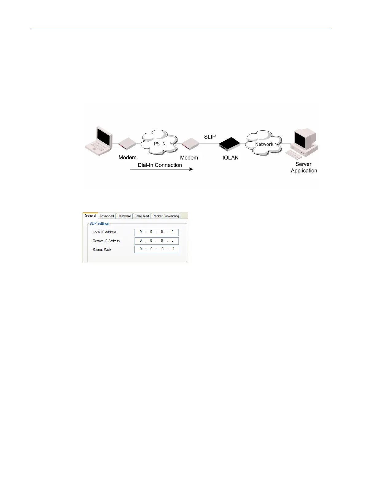 connection to the IOLAN’s serial port. This is typically used with a modem for dial-in or dial-out