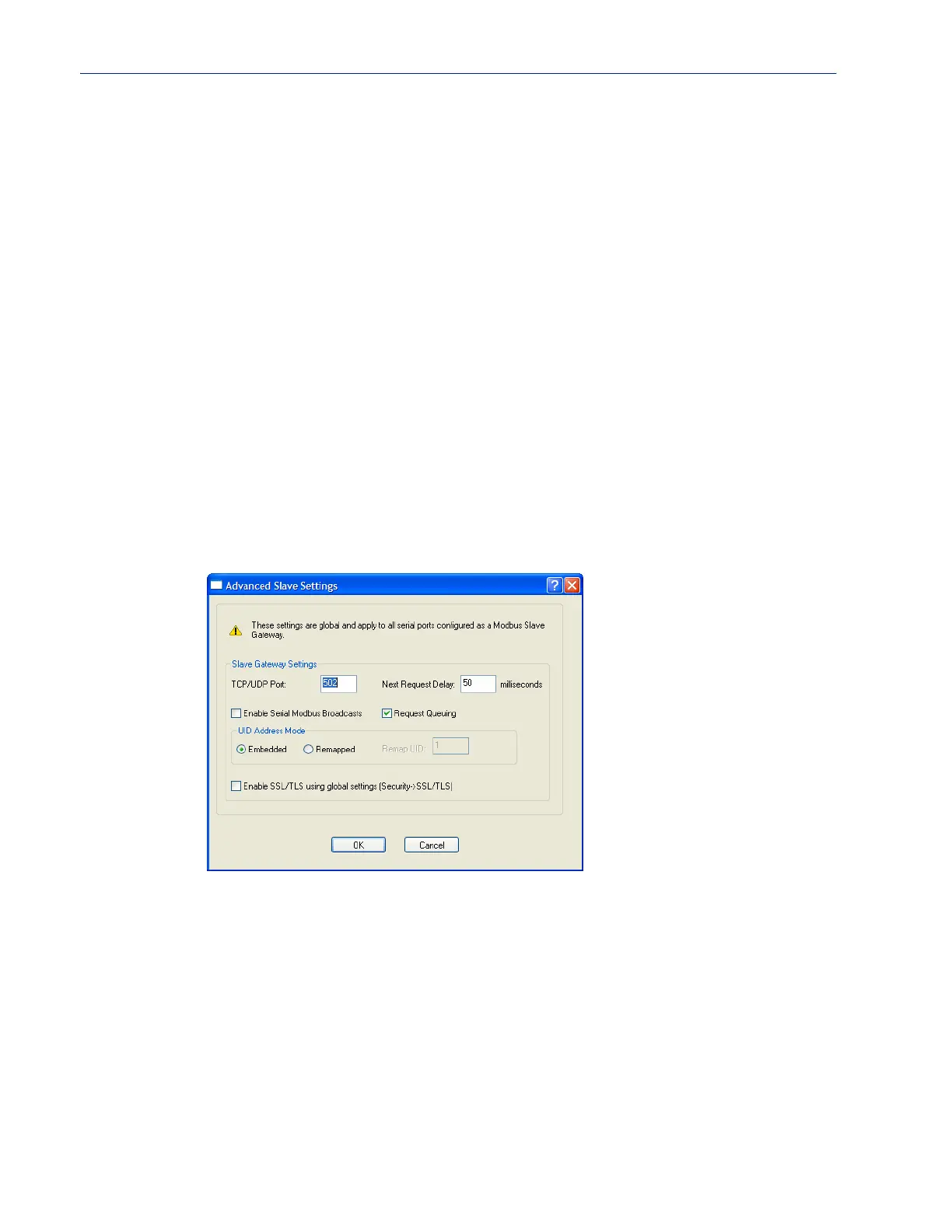The parameters in this window configure global Modbus gateway settings that apply to all serial ports