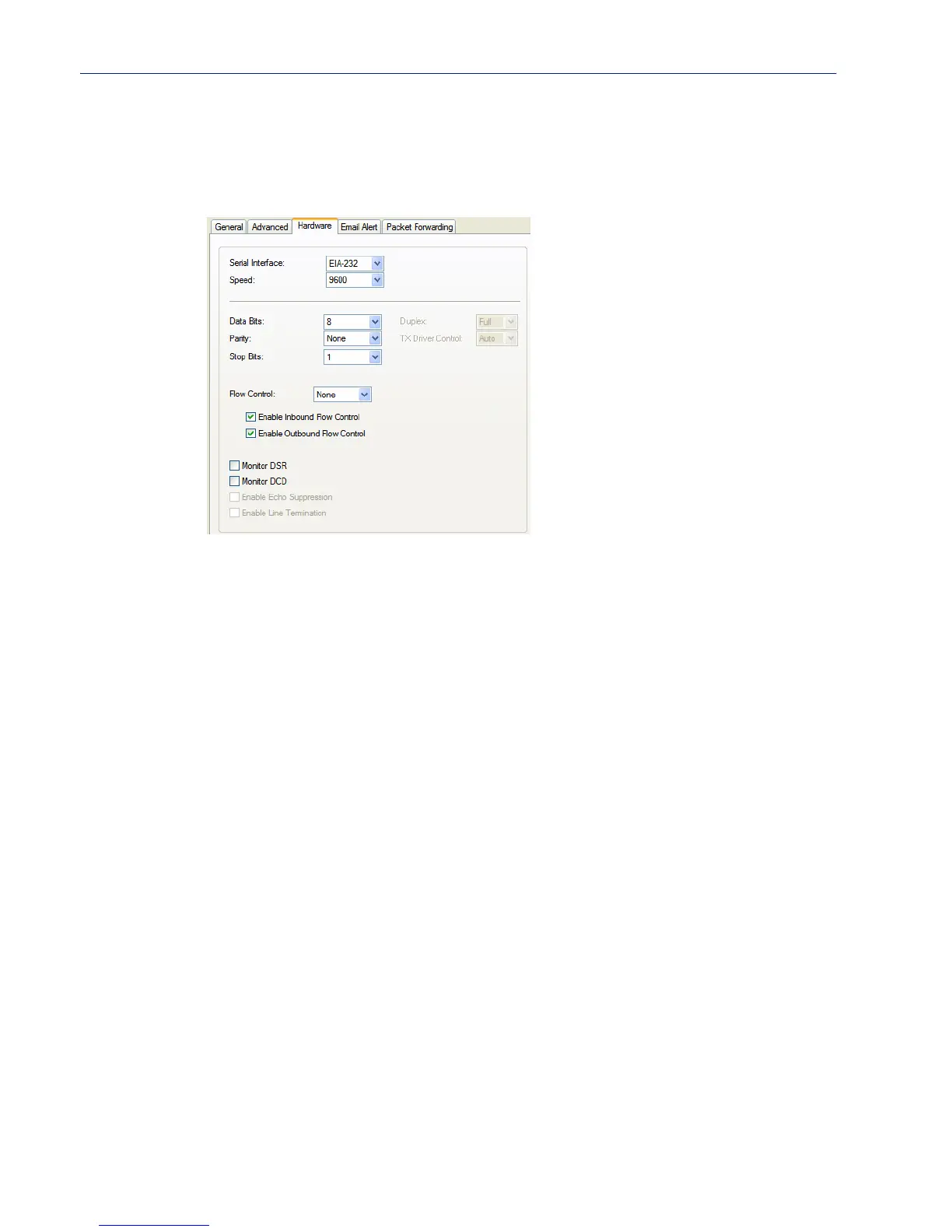 The Hardware tab configures all the serial port hardware connection information. The window below