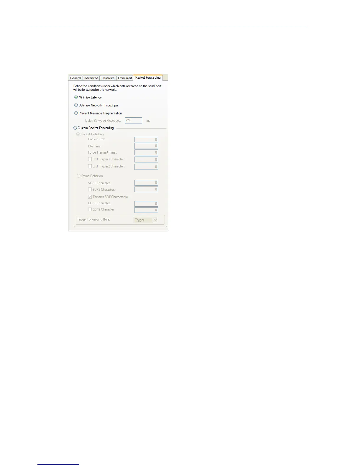 The Packet Forwarding tab can be used to control/define how and when serial port data packets are