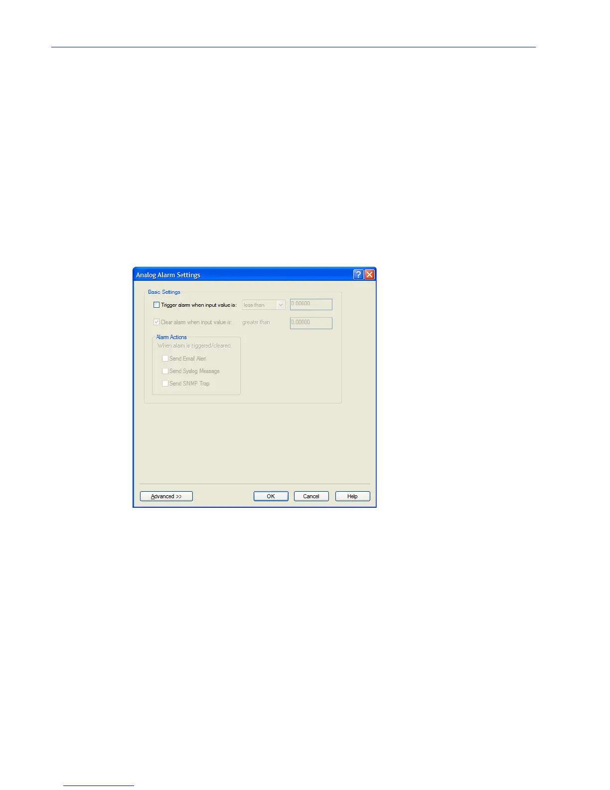 The basic Analog Alarm Settings window allows you to configure one severity alarm, whereas the