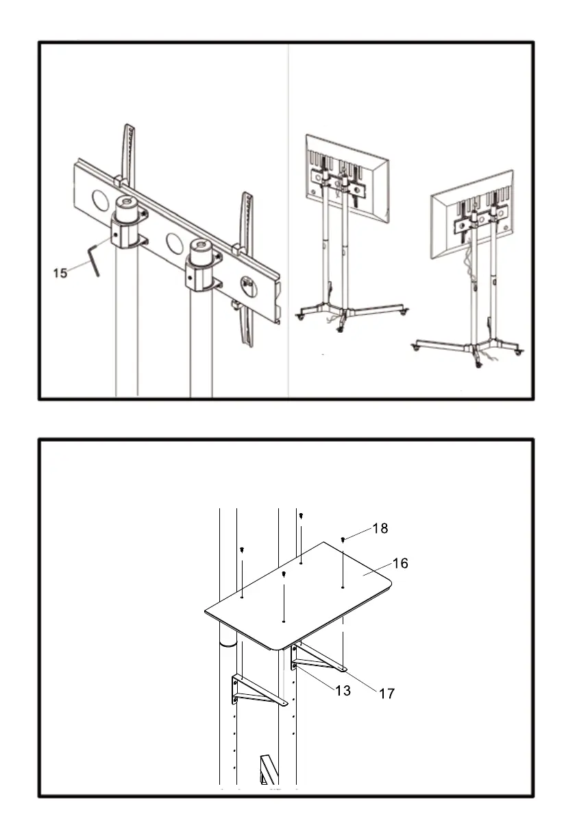 Befestigung das Regal (16) mit vier Senkschrauben M4x6 (18) an den Stützen (17)