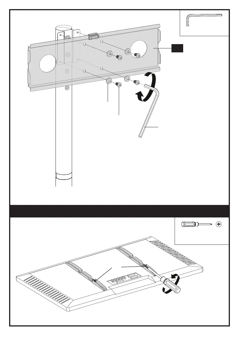 Secure the TV plate [09] to the upper pole [07]. Make sure the TV plate is leveled.