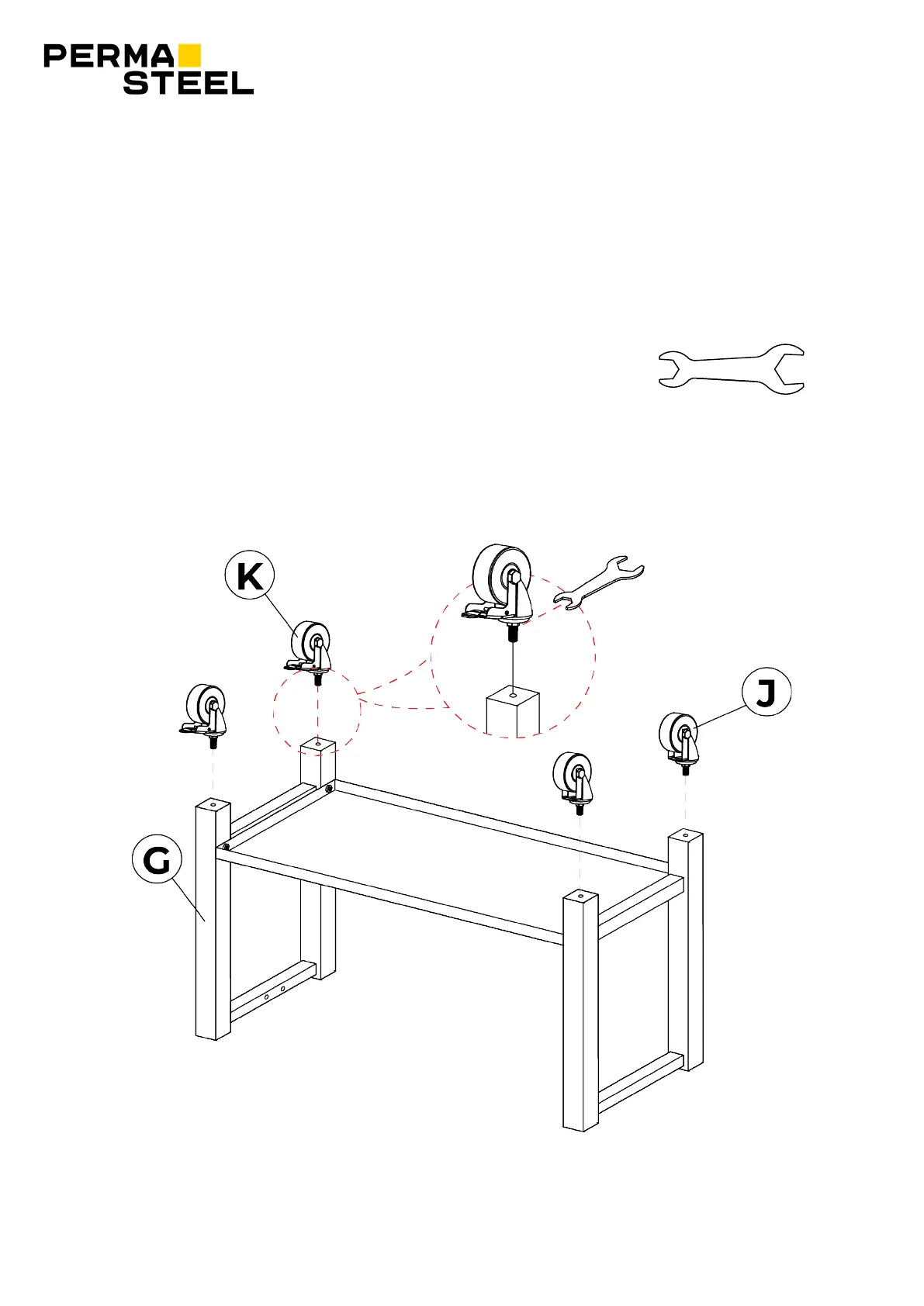 Inserte y enrosque las ruedas (J) en el marco de la pata (G) con la llave de boca provista.