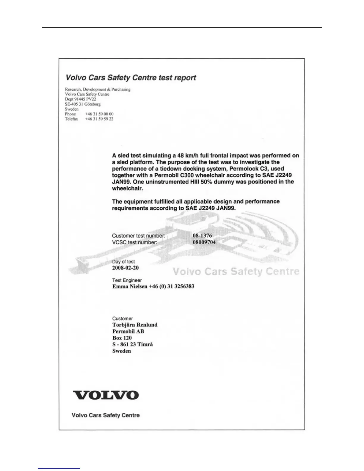 Permobil Permolock C3 - Sled test report; Volvo Cars Safety Centre test report (SAE J2249)