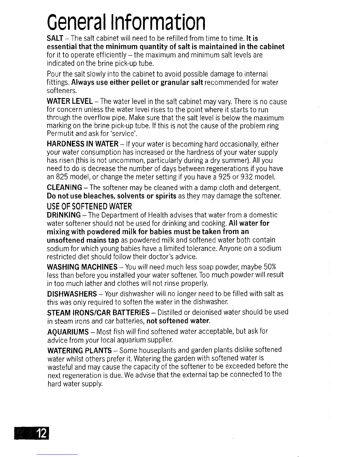 Permutit 825 - General Information; Salt; Water Level; Water Hardness; Cleaning; Use of Softened Water