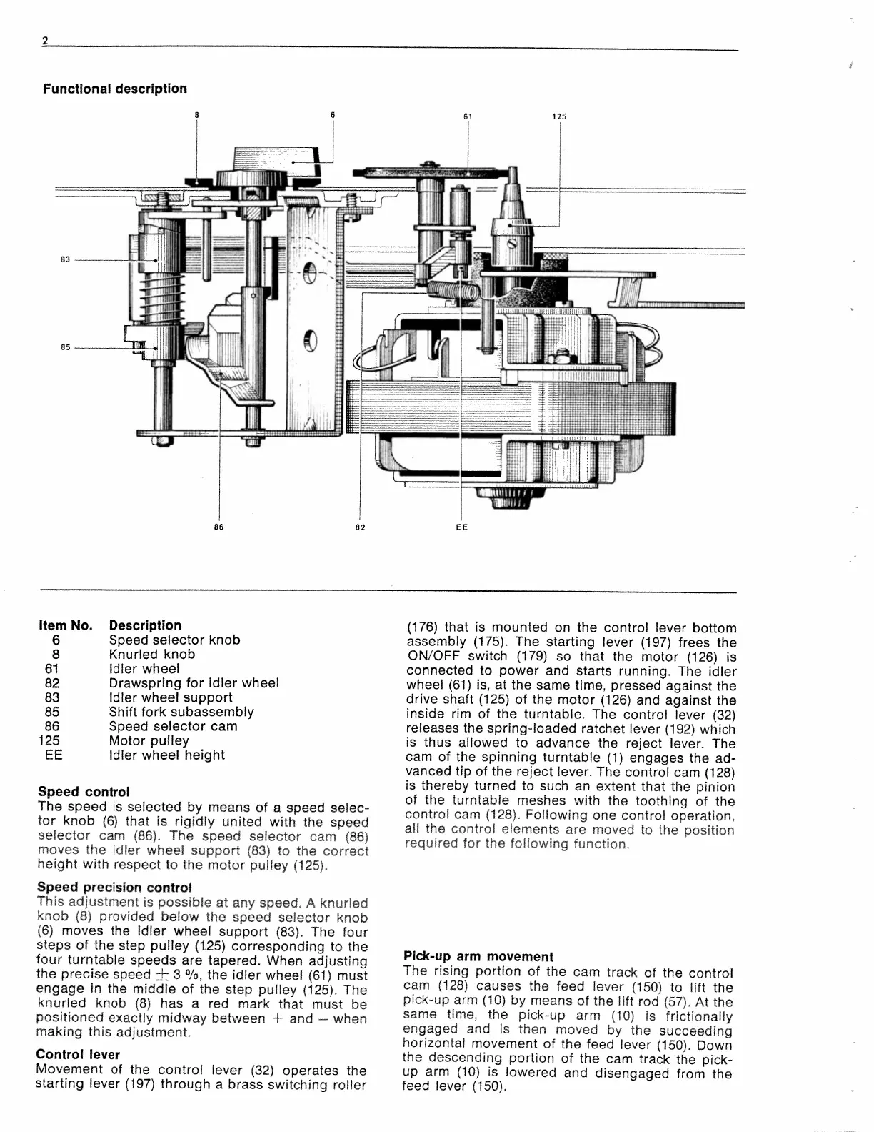 PERPETUUM EBNER PE 2020 - Functional Description; Speed Control and Selection Mechanism; Control Lever and Actuator Operation; Pick-up Arm Movement Automation