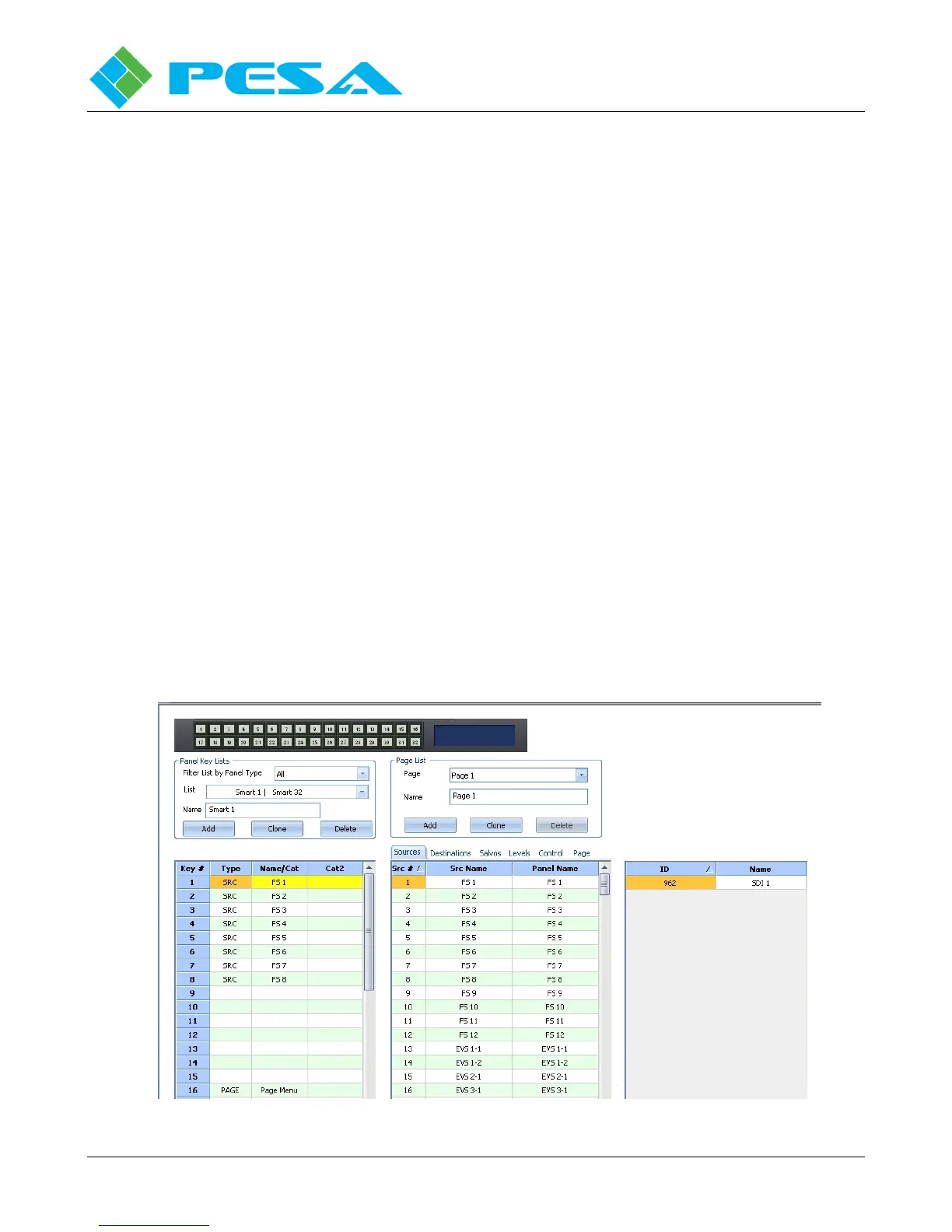 PESA’s Smart 32 remote control panel provides 32 front panel keys, any of which may be assigned to