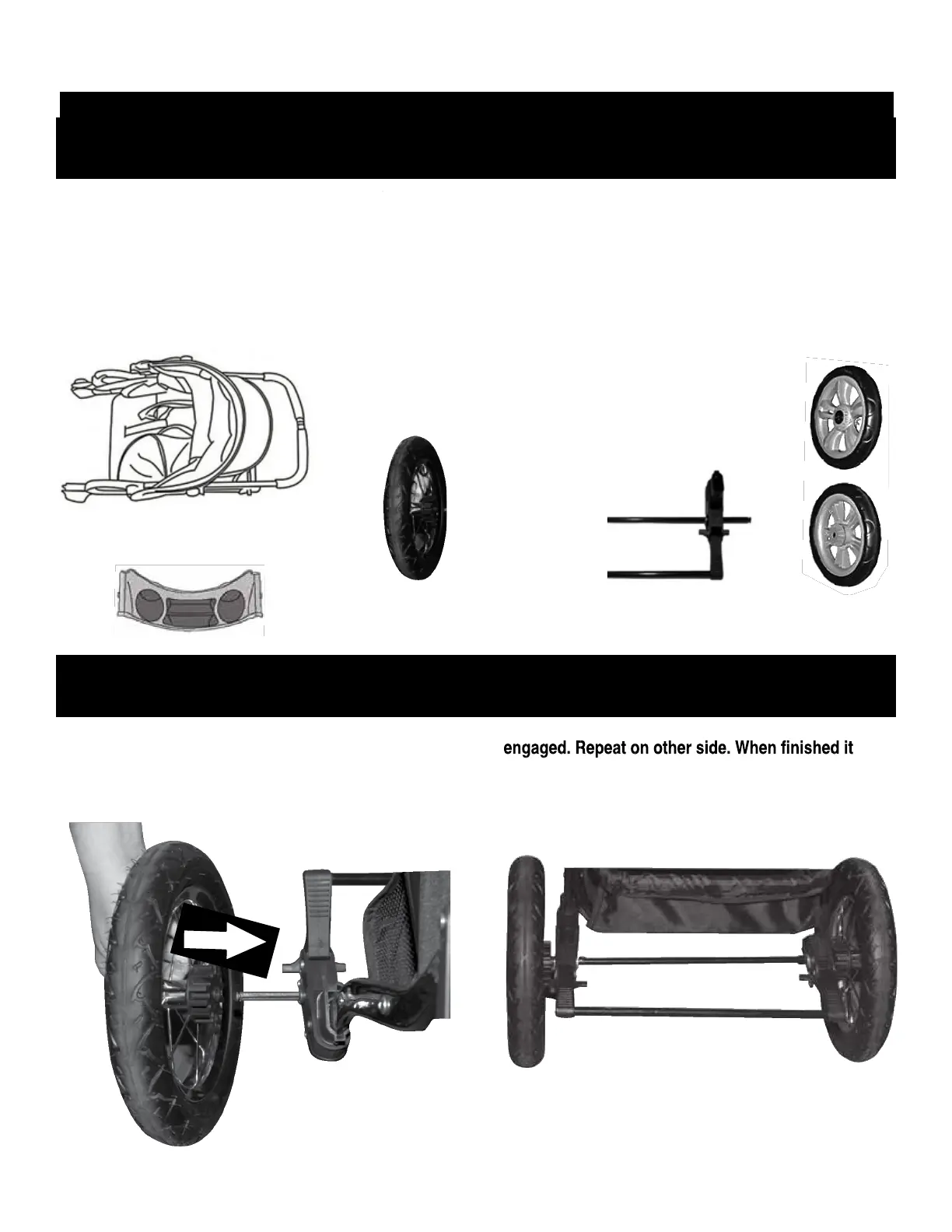 Step 1. Push back wheels on to axle, as shown Step 2. Pull on wheel to make sure the