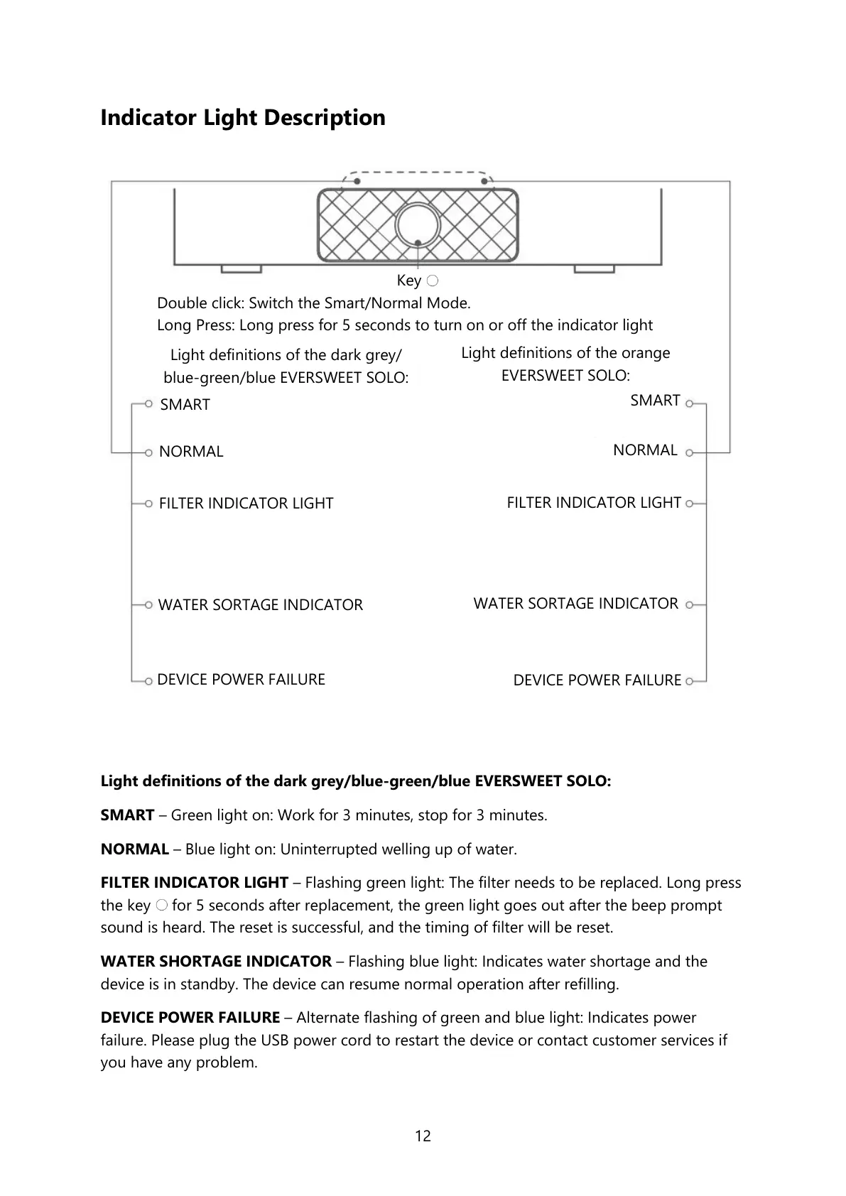 FILTER INDICATOR LIGHT – Flashing green light: The filter needs to be replaced. Long press