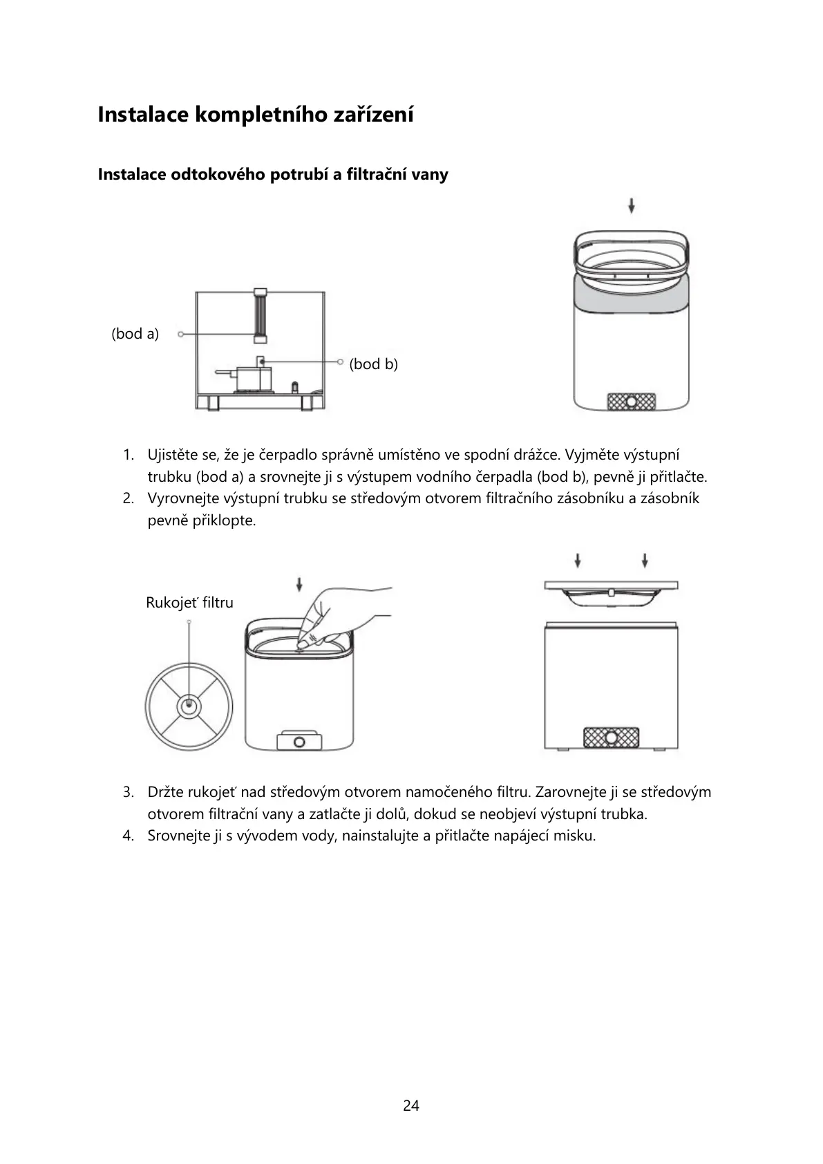 otvorem filtrační vany a zatlačte ji dolů, dokud se neobjeví výstupní trubka.