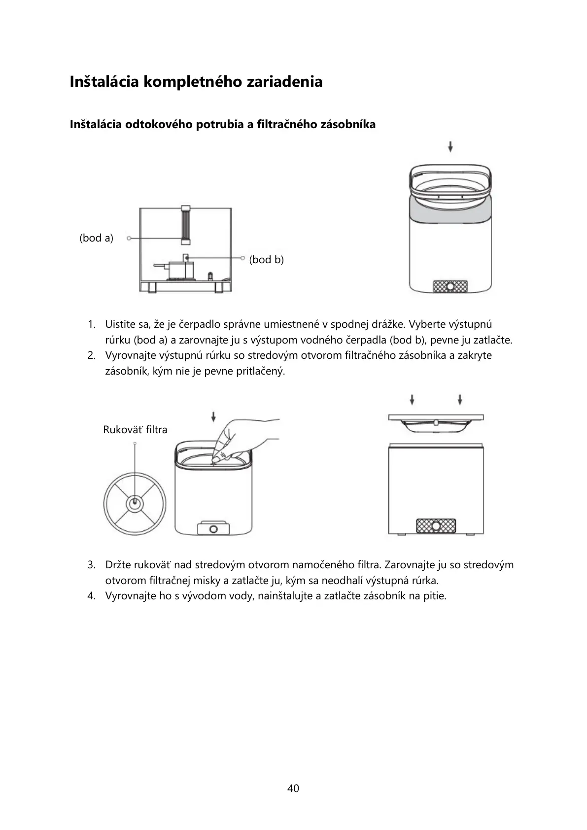 rúrku (bod a) a zarovnajte ju s výstupom vodného čerpadla (bod b), pevne ju zatlačte.