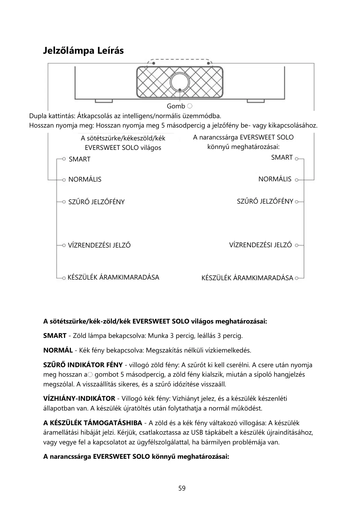 VÍZHIÁNY-INDIKÁTOR - Villogó kék fény: Vízhiányt jelez, és a készülék készenléti