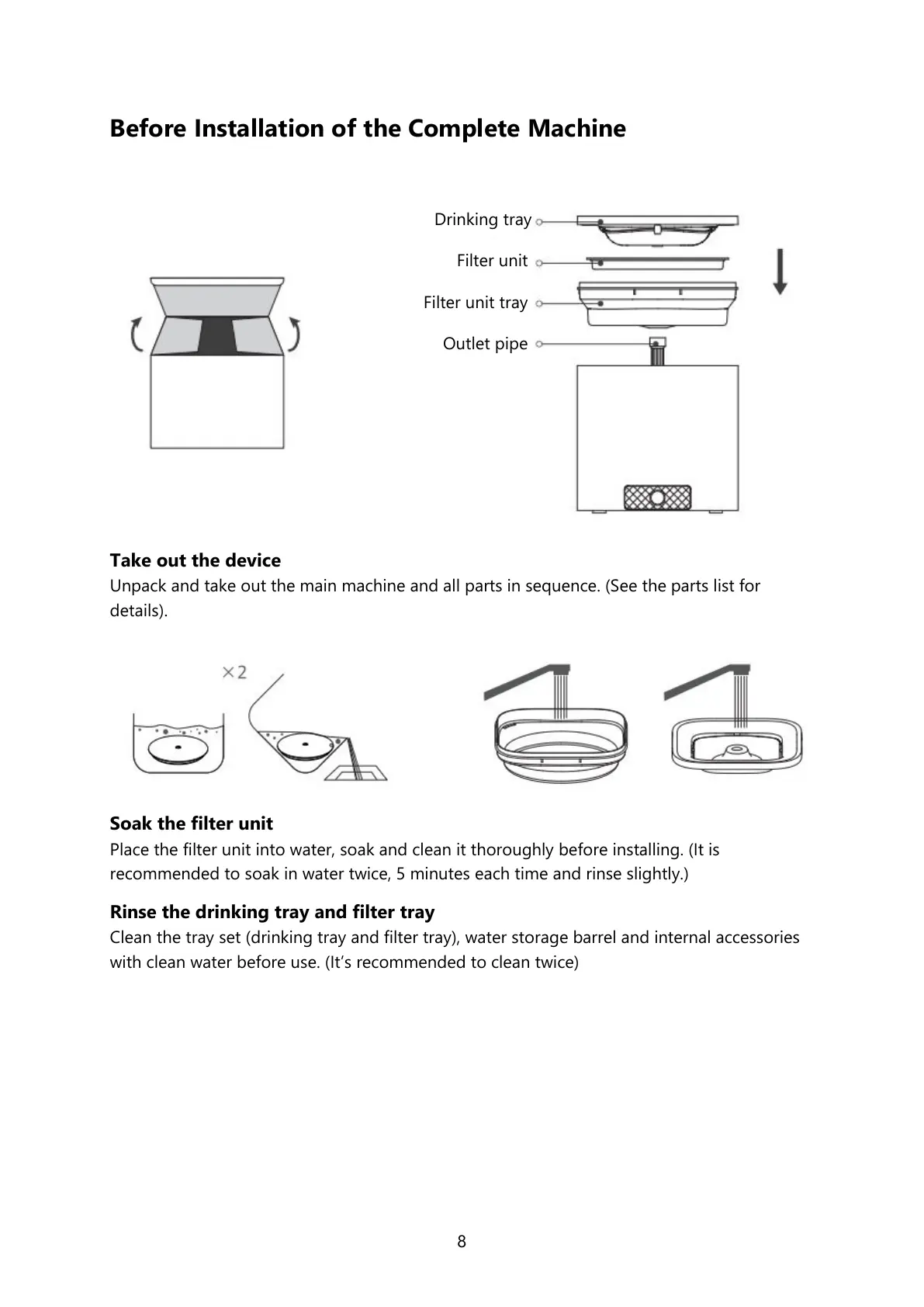 Clean the tray set (drinking tray and filter tray), water storage barrel and internal accessories